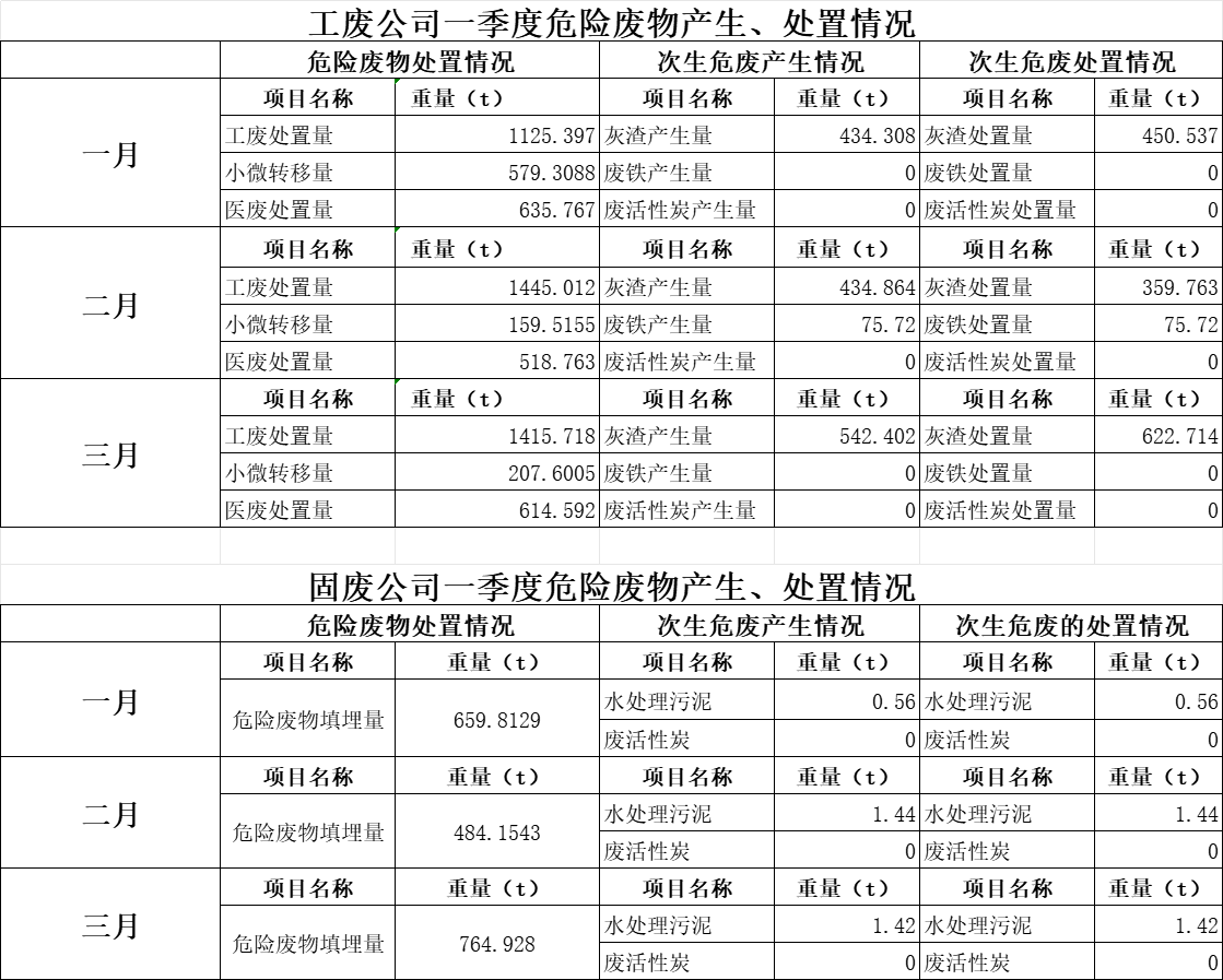 一季度工(gōng)廢(固廢)公司危險廢物産生(shēng)、處置情況及環境監測數據彙總